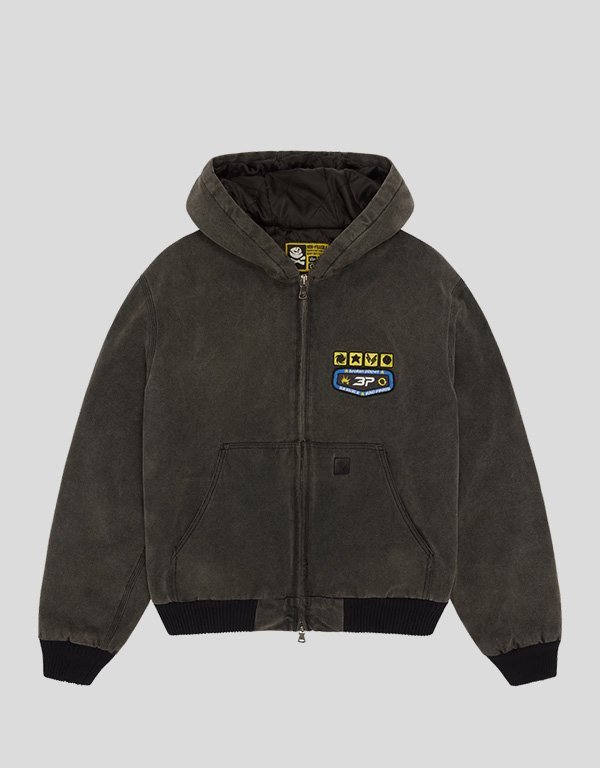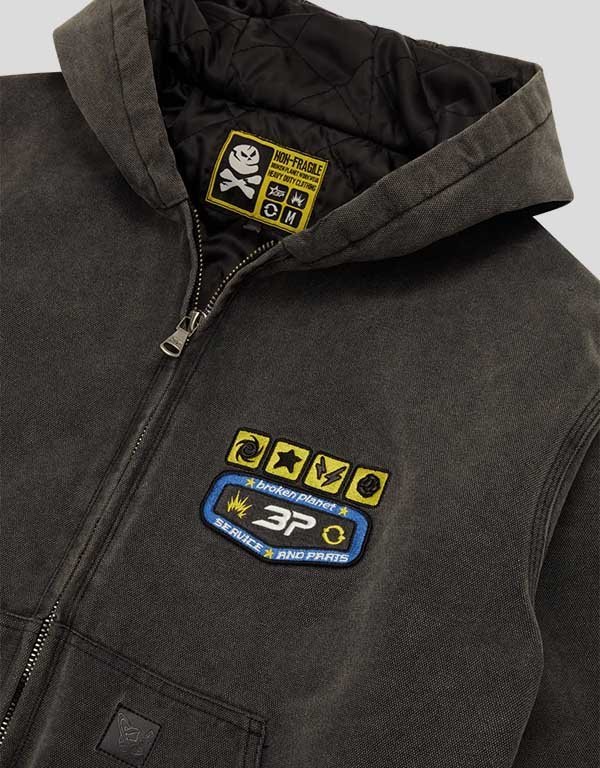 Upgrade your outerwear collection with the Broken Planet Workwear Grey Bomber Jacket. Crafted from durable cotton with a soft viscose lining, this jacket offers warmth and everyday comfort. The charcoal color provides a sleek, versatile look, while embroidered patches on the chest and sleeve add unique branded detail. The embossed logo on the back delivers a bold statement, making this piece stand out. Practical faux leather patches on the front pockets add a touch of rugged style, while the hooded collar and rib-knit cuffs keep you cozy and protected from the elements. Perfect for layering over casual or streetwear outfits.