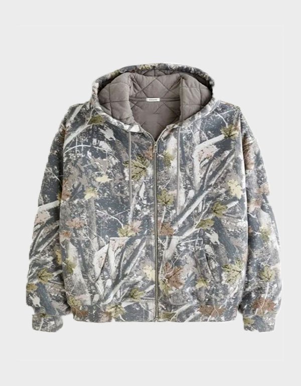 Stay warm in style with the Abercrombie Camo Quilted Grey White Pullover Hoodie. Crafted from soft fleece fabric with a plush viscose lining, this hoodie features a quilted design for added warmth and texture. The front zip closure offers easy layering, while the hooded collar and rib-knit cuffs and hem seal in comfort. With two welt pockets on the waist and two inside, it combines function and style for everyday wear. The grey and white camo pattern gives it a rugged yet versatile look, perfect for casual outings or outdoor adventures.