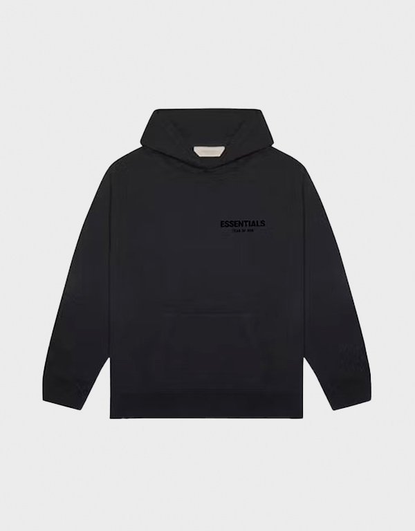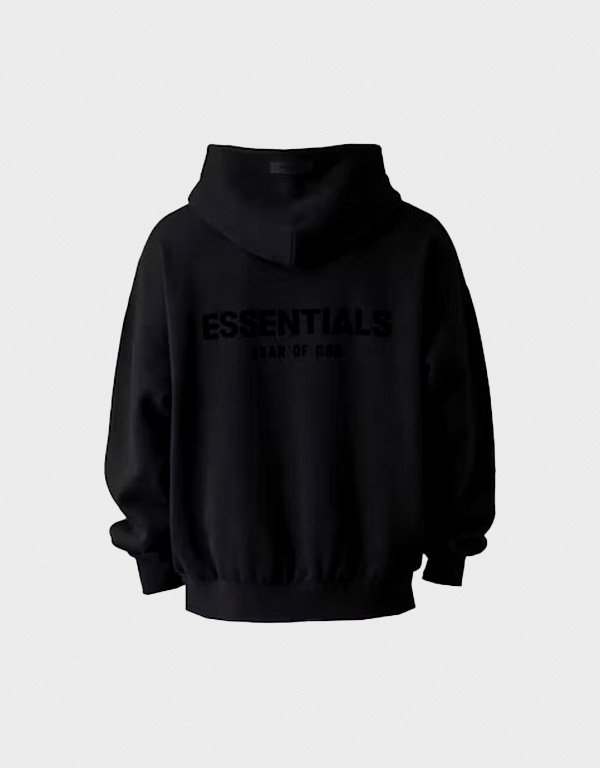 Key features include a hooded collar with adjustable drawstrings, rib-knit cuffs and hem for a secure fit, and a spacious kangaroo pouch pocket. The hoodie showcases a minimalist design with the Fear of God Essentials logo subtly printed on the chest in a tonal black called “Stretch Limo,” paired with a sleek solid black colorway.