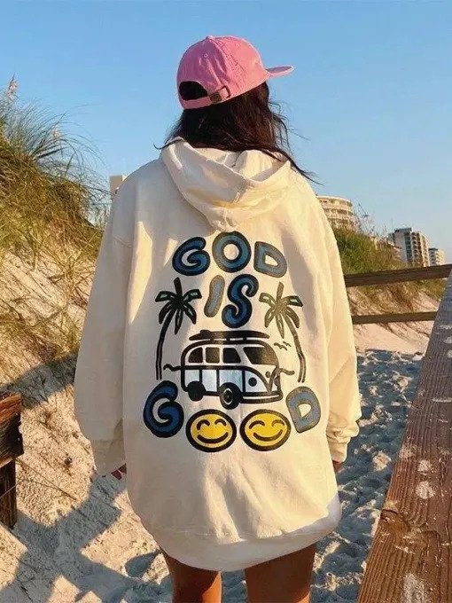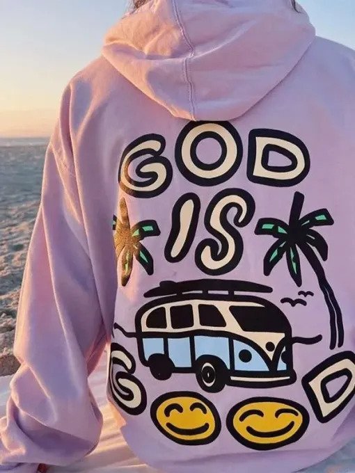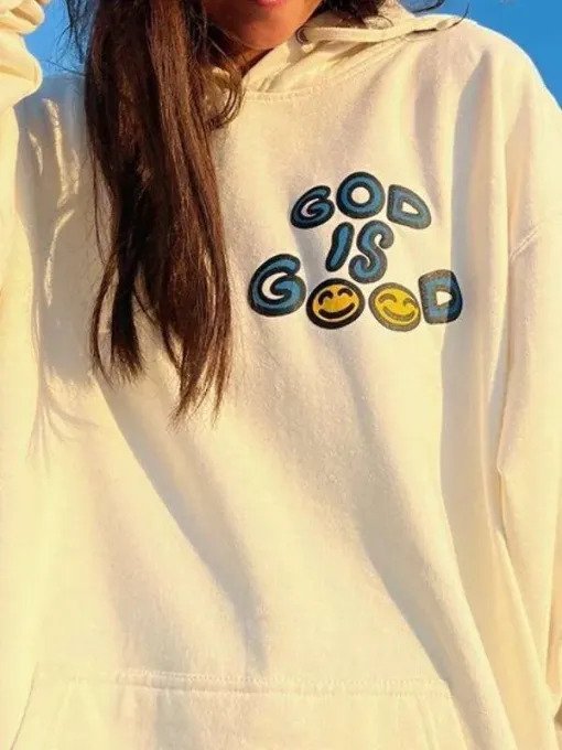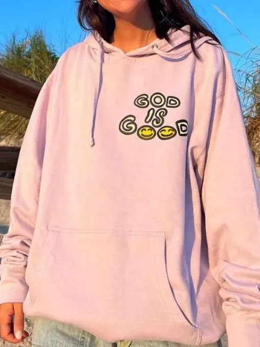 The “God Is Good” Oversized Puff Print Hoodie is a premium pullover fleece hoodie available in colors like pink and cream. It combines comfort with a bold graphic message in a puff print style.