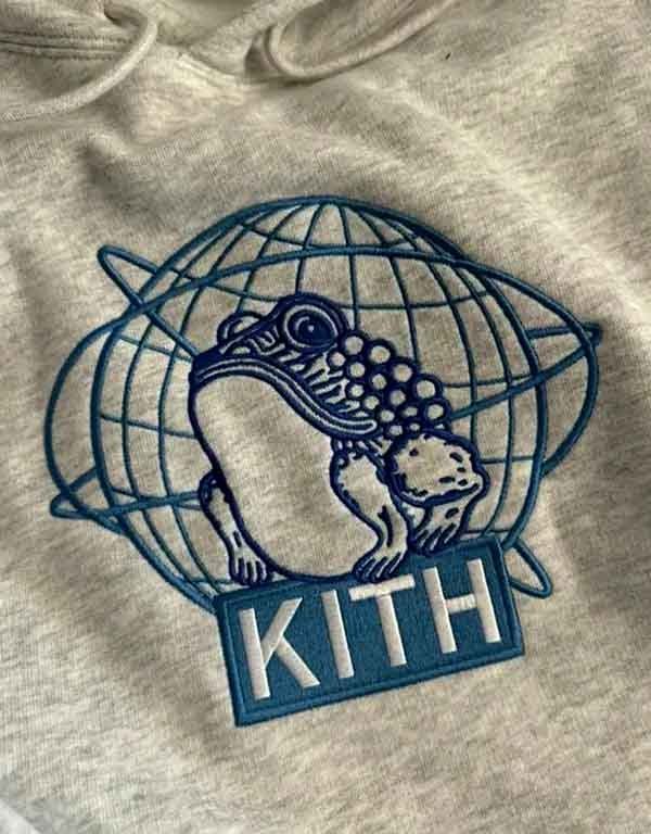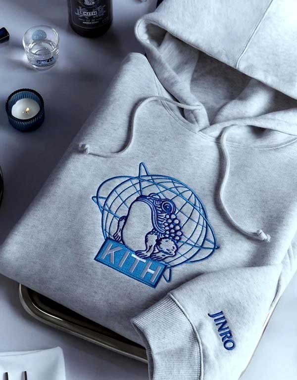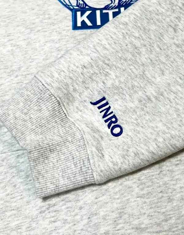 The hoodie comes in a versatile grey color and represents a special collaborative design celebrating Kith’s presence in Seoul alongside Jinro, blending streetwear aesthetics with cultural homage.