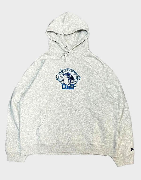 The Kith x Jinro Seoul Grey Hoodie is a stylish pullover crafted from soft fleece fabric with a comfortable viscose inner lining. It features a classic pullover design with a hooded collar equipped with a drawstring for customizable fit. The hoodie has full-length sleeves with rib-knitted cuffs and a rib-knitted hemline to keep warmth in. A spacious kangaroo pouch pocket adds convenience and practicality.