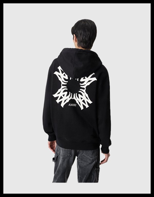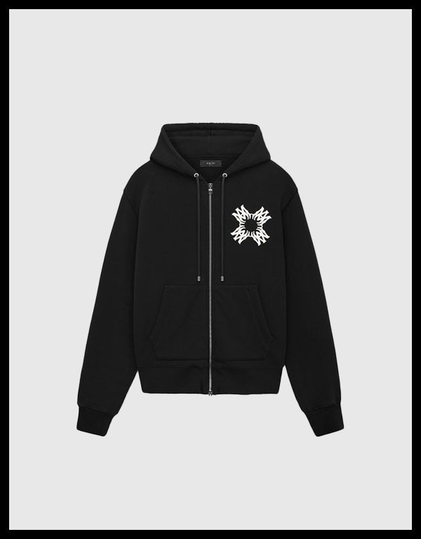 The Ma Quad Zipper Black Fleece Hoodie—officially the AMIRI MA Quad Zip Up Hoodie for Autumn-Winter 2024—is a premium black zip-up sweatshirt defined by the brand’s new MA Quad monogram, which appears as bold graphics at the front and back. It is crafted in Italy, primarily from 100% cotton fleece for most versions, though some listings note an outer blend of 95% cotton and 5% elastane with a lining of 100% lyocell for added stretch and comfort.