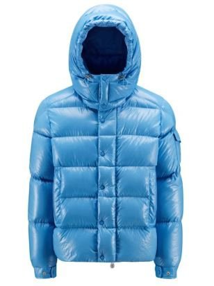 The Moncler Maya Sky Blue Short Down Puffer Jacket is a stylish and warm outerwear piece crafted for comfort and function in colder weather.