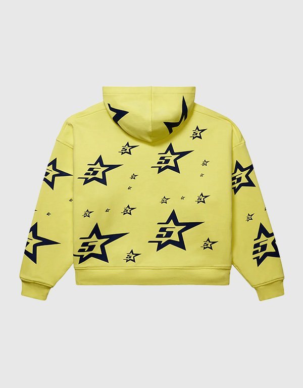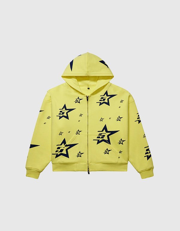 The Sp5der Double Layer 5 Star Zip Yellow Hoodie is a high-quality streetwear zip-up hoodie featuring a double-layer design that enhances warmth and durability.