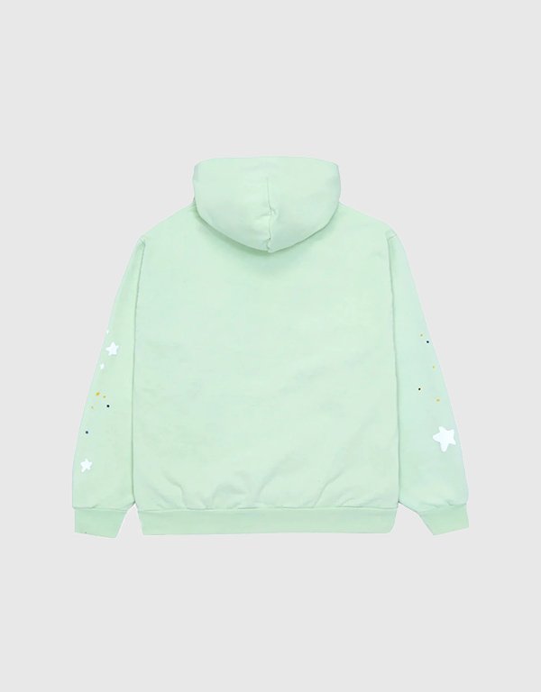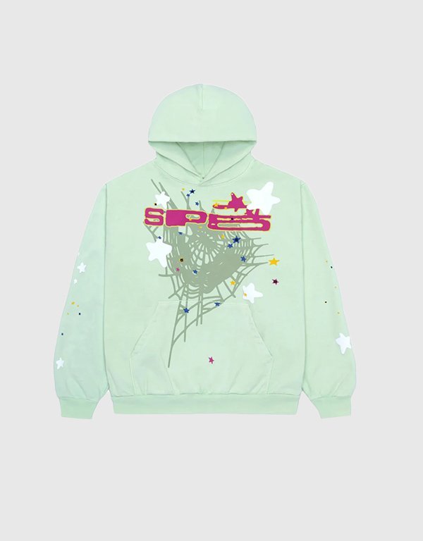 The Sp5der SP5 Pullover Mint Hoodie is a standout piece from the Sp5der collection, known for its urban streetwear appeal and soft fleece fabric.