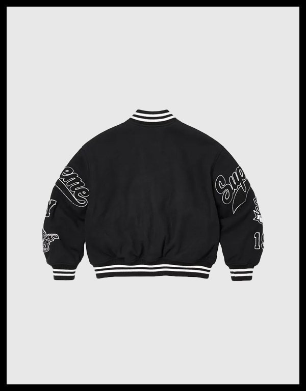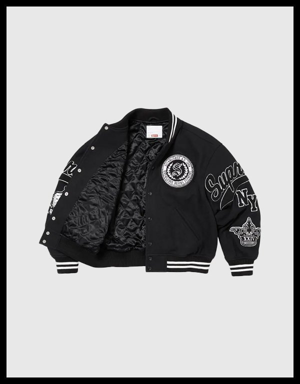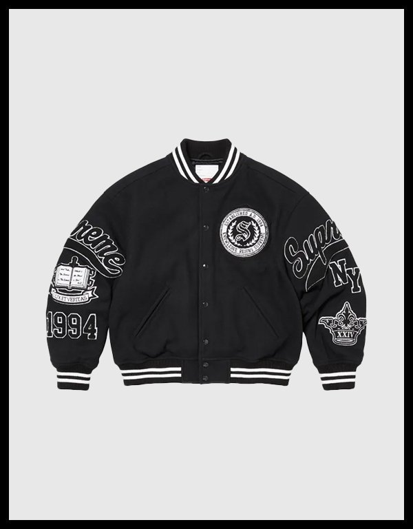 The Supreme Veritas Black Varsity Jacket from the Fall/Winter 2024 collection is a premium varsity jacket featuring: